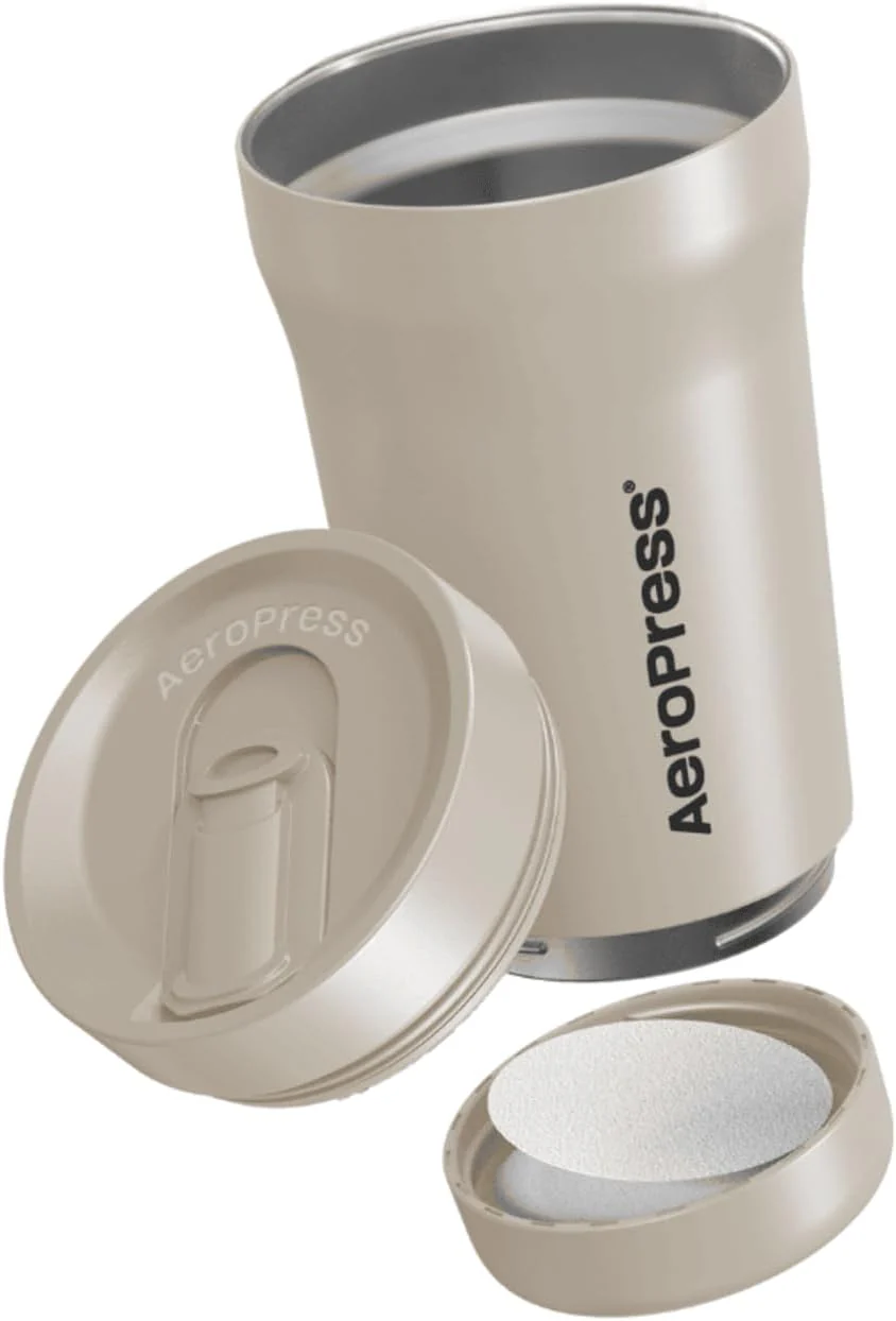 The Stainless Steel AeroPress Travel Coffee Tumbler is the perfect coffee lover’s companion for any adventure, whether it’s to the office, at a hotel or Airbnb, or on a road trip. The tumbler top is sized to support all standard size AeroPress brewers, like Clear & Original, making brewing directly into the tumbler fast and convenient. (For a complete travel system where the AeroPress brewer is designed to fit inside the tumbler for easy storage try the AeroPress Go Plus).